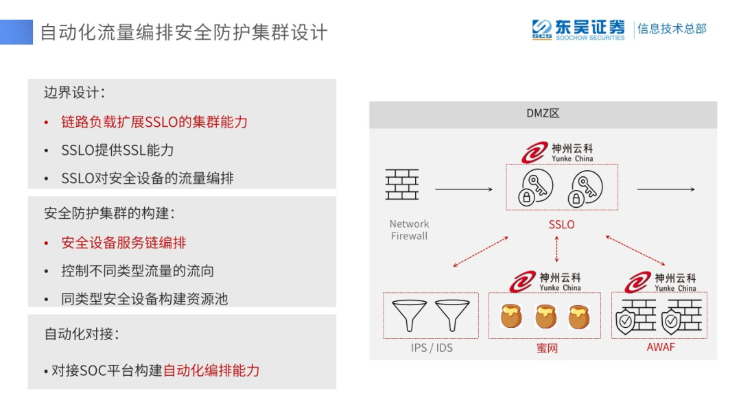 經(jīng)過以上架構(gòu)替換,東吳證券解決了串聯(lián)架構(gòu)的擴展性問題、加密流量可見性問題以及安全策略無法適應(yīng)業(yè)務(wù)敏捷迭代問題,提升了運維的靈活性,實現(xiàn)了基于服務(wù)鏈的流量調(diào)度,保障了網(wǎng)絡(luò)和安全投資回報最大化。