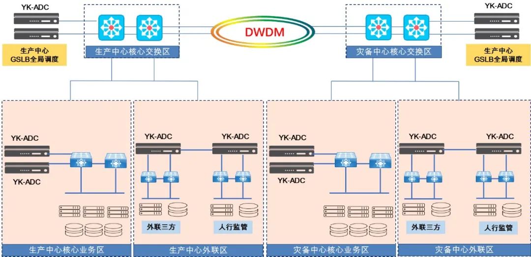 生產(chǎn)中心和災(zāi)備中心為對稱部署,兩個中心使用波分技術(shù)實(shí)現(xiàn)互相連接;