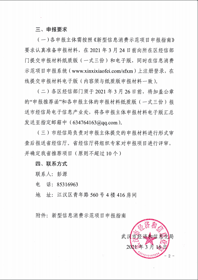 各申報企業(yè)需按照《新型信息消費示范項目申報指南》要求認真準備申報材料,在2021年3月23日17:00之前提交申報材料紙質(zhì)版(一式三份)至東湖高新區(qū)政務(wù)中心7號樓7016室和word電子版及PDF蓋章版一并打包發(fā)送至郵箱1930171438@qq.com,同時在信息消費示范項目申報系統(tǒng)(www.xinxixiaofei.com/sfxm)上注冊登錄,在線提交申報材料電子版(內(nèi)容須與紙質(zhì)版申報材料一致)。